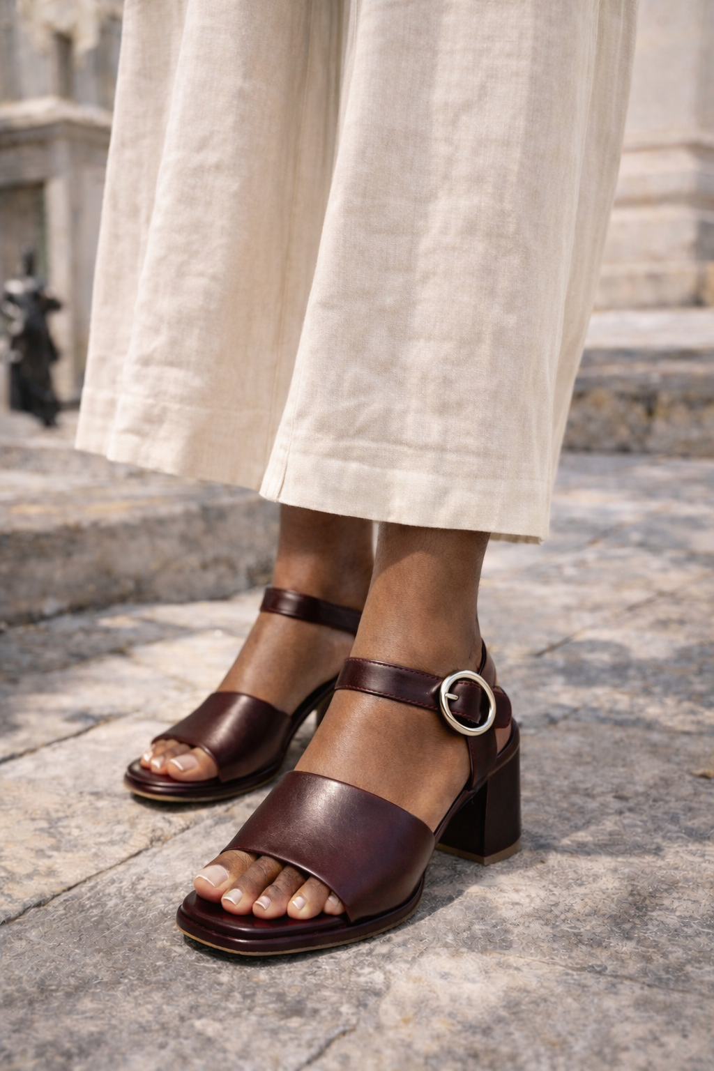 Διαθέτουν πλατύ δερμάτινο λουράκι που αναδεικνύει κομψά το πόδι, ρυθμιζόμενο slingback λουράκι με στρογγυλή ασημί μεταλλική αγκράφα για σταθερή και άνετη εφαρμογή, ενώ το χοντρό τακούνι εξασφαλίζει σταθερότητα χωρίς να θυσιάζει την κομψότητα. Ο μαλακός εσωτερικός πάτος χαρίζει άνεση ακόμα και σε πολύωρη χρήση.