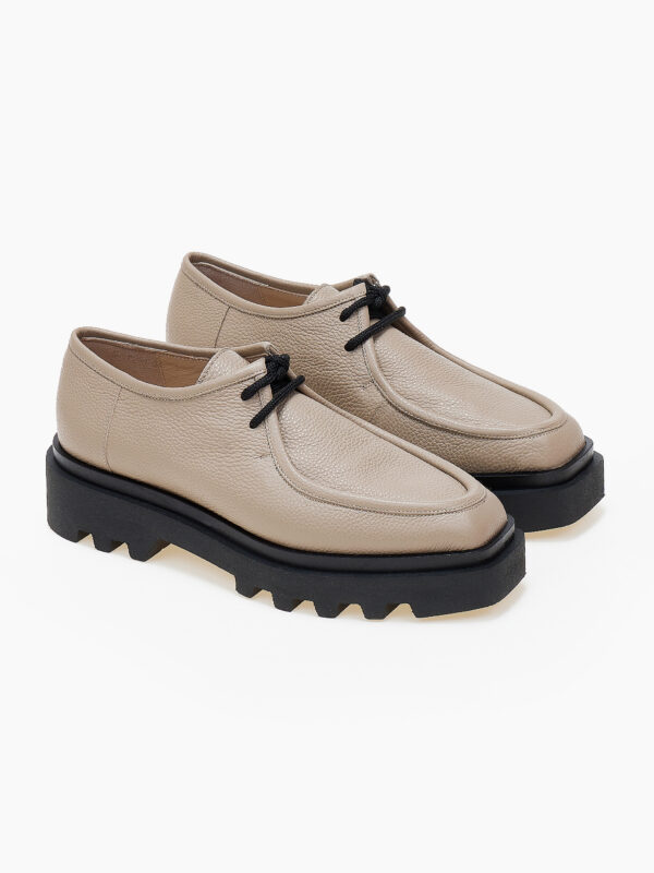 Derbies σε neutral taupe Caviar, που αποπνέουν minimal πολυτέλεια και απόλυτη ισορροπία ανάμεσα στο ανδρόγυνο και το θηλυκό στυλ.