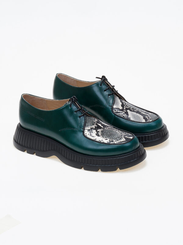 Εντυπωσιακά derbies σε πράσινο Sierra με python λεπτομέρειες και μαύρες πινελιές. Το design συνδυάζει ένταση και φινέτσα, δημιουργώντας ένα look με προσωπικότητα και fashion statement διάθεση.