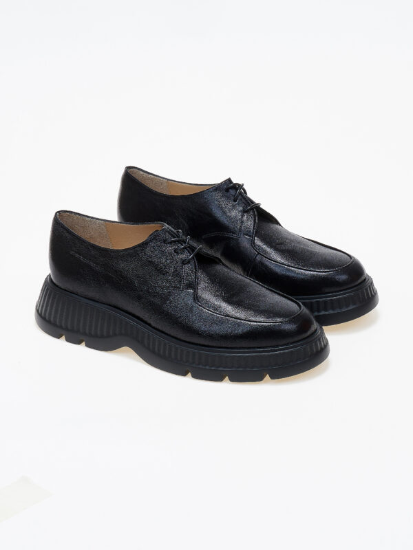 Κλασικά derbies σε metallic μαύρο, με μοντέρνο twist που αντικατοπτρίζει τη λάμψη του φετινού urban chic. Διαχρονικό σχέδιο που απογειώνει τα office και after-work looks.